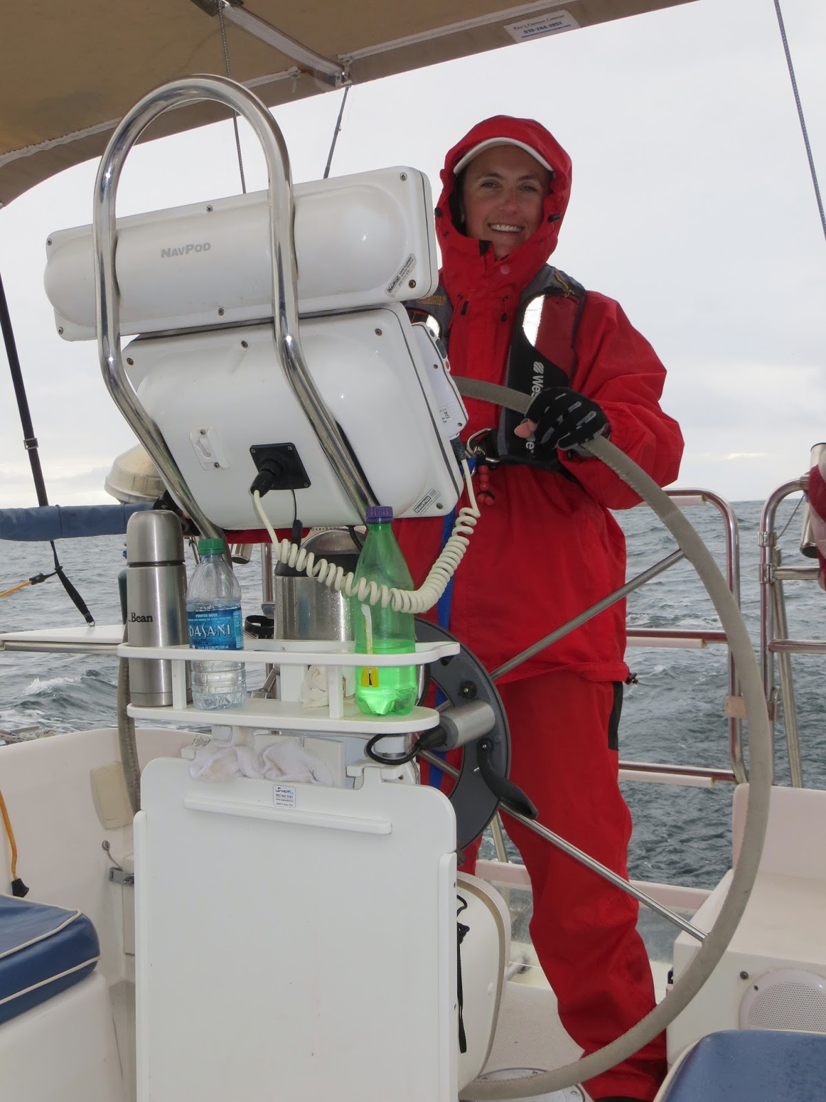 View from the cosy cabin of Dennis standing watch in the rain